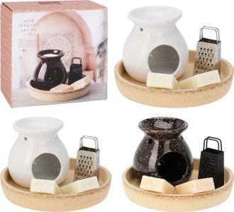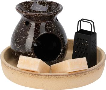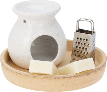 Här får du allt du behöver: en porslinsaromalampa, två väldoftande vaxblock, ett minirivjärn och en vacker rund träbricka som bas – för en både praktisk och dekorativ lösning.