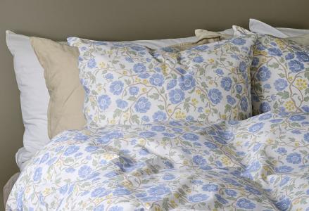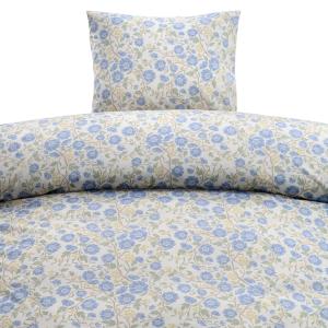 Setet består av ett påslakan och ett örngott med ett vackert tryckt mönster av blå och gula blommor med gröna blad på en ljus bakgrund.
