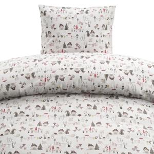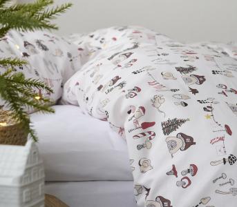 Det tryckta mönstret med vintriga detaljer som små möss, julgranar, sockor och svampar skapar en lekfull och stämningsfull känsla – perfekt för vintern och julens alla mysiga nätter.