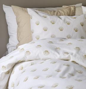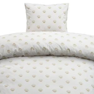 Setet består av ett påslakan och ett örngott med ett vackert tryckt mönster av guldiga snäckor på en ljus botten.
