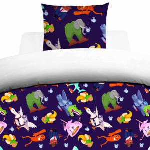 Den mörka bakgrunden framhäver motiven och skapar en snygg kontrast som passar lika bra i ungdomsrum som hos den som uppskattar internetkultur och humor. Bäddsetet är tvådelat och innehåller ett påslakan samt ett matchande örngott.