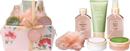 Badsetet innehåller allt du behöver för en komplett kroppsvårdsrutin: body lotion, body mist, shower gel, body scrub, hand cream samt en mjuk badsvamp.