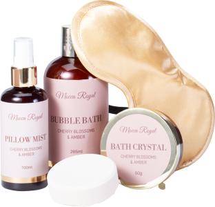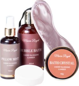 Lyxigt presentset för bad och avkoppling. Setet innehåller Bubble Shower Gel (265 ml), Pillow Mist (100 ml), Bath Fizzer (60 g), Bath Salt (70 g) och en sidenögonmask – allt med en ljuvlig doft av Cherry Blossom & Amber. Perfekt för en avslappnande stund hemma.