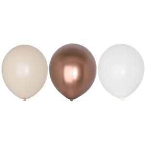 Dekorera din fest med eleganta och trendiga latexballonger i naturliga och jordnära toner. Detta 6-pack innehåller en harmonisk färgkombination av 2 vita, 2 metallic bruna och 2 beige ballonger, vilket gör dem perfekta för bröllop, baby shower, dop, födelsedagskalas eller andra festliga tillfällen.