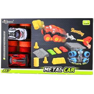 Racerbilset med två metallbilar – roterbara hjul, 360-graders rotation och skjutfunktioner. Perfekt för lekfulla hinderbanor!