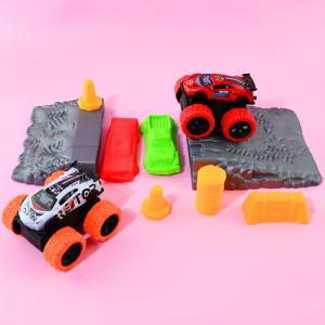 Setet innehåller bilar med roterbara hjul, 360-graders rotation och spännande skjutfunktioner, samt olika tillbehör för att skapa egna hinderbanor. Bilarnas färger skickas slumpvis och varje bil mäter ca 7x5 cm.