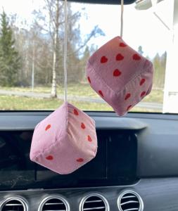 2 st biltärningar i plysch med röda hjärtan.