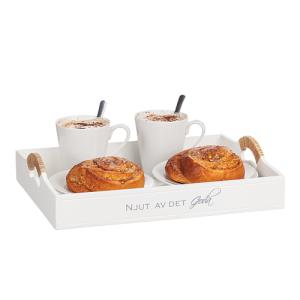 Träbricka vitmålad och med texten "Njut av det goda" ca 25x35cm.