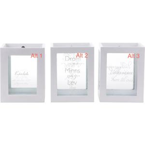 Vacker stilren trälykta med budskap, ca 14x18cm. Finns med 3st olika texter. OBS Glöm ej välja alternativ. Alt 1: Små små ord av Kärlek sagda varje dag skänker här i livet glädje och behag Alt 2: Dröm om morgondagen Minns gårdagen Lev idag Alt 3: Välkommen hem till oss