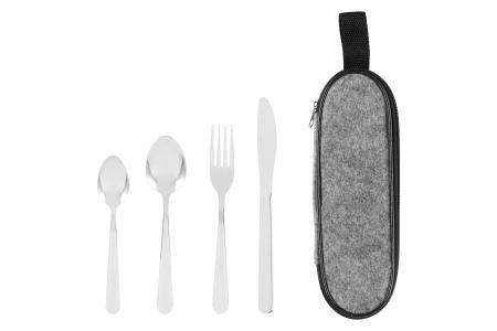 Hållbara bestick som tål diskmaskin i en praktisk förvaringspåse med bältesslinga. Setet innehåller: 1st fodral med dragkedja, 1st kniv (20cm), 1st gaffel (18cm), 1st matsked (18cm) och 1st tesked (15cm). Fodralet har en plastad insida vilket gör det lätt att rengöra.