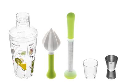 Coctailset i 5-delar innehållande barmått med dubbla mätkoppar 3cl/2cl, mätkopp av plast 50ml, muddler och citronpress. Material: plast och stål. Handdisk rekommenderas.
