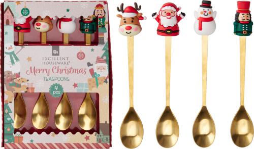 Fint 4-pack teskedar eller dessertgafflar med julfigurer: ren, tomte, snögubbe och nötknäppare. Guldfärgade med detaljerade dekorationer.
