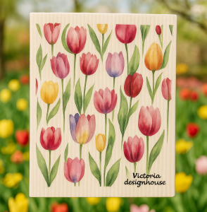 Med ett färgglatt tryck av tulpaner sprider den både glädje och vårkänslor i köket.