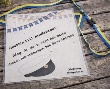 Text: “Grattis till studenten! Idag är du värd det bästa. Disken och städningen kan du ta imorgon.”