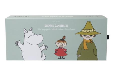 Upptäck Mumin-doftljus i set om 3 med dofter av sandelträ, röd grapefrukt och söt amber. Ljusen är gjorda av 100 % sojavax i glasburkar. Perfekta för en lugn och mysig stämning hemma.