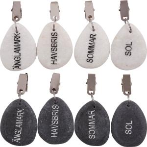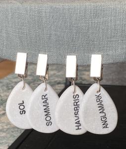 Duktyngder (stenar) med somrig text. Texterna är "ÄNGLAMARK", "HAVSBRIS", "SOMMAR" och "SOL".