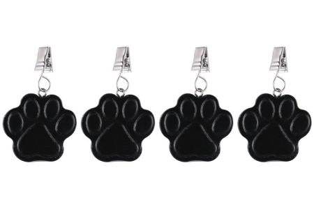 Set med 4st duktyngder med tassmotiv som håller dukar på plats inomhus och utomhus. Enkla att fästa.
