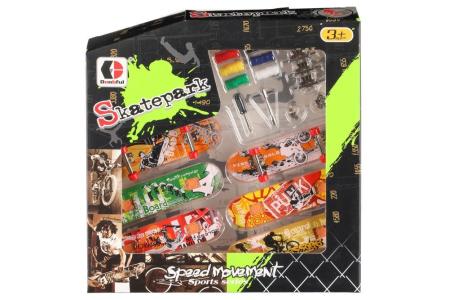 Bygg, trimma och gör tricks! Set med finger skateboards – 2 färdigmonterade, 4 extra deck, hjul, truckar och verktyg.