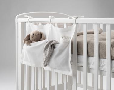 Praktisk hängförvaring i 100% bomull som enkelt knyts fast i spjälsängens ribbor. Förvaringen har två fack – perfekt för blöjor, nappar och andra småsaker som du vill ha nära till hands.