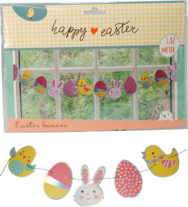 Skapa en härlig påskstämning hemma med vår charmiga girlang med påskägg, kycklingar och harar.