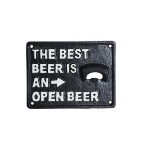 Väggmonterad kapsylöppnare i gjutjärn med texten "THE BEST BEER IS AN OPEN BEER". Perfekt för kök, bar eller uteplats.