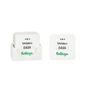 Glasunderlägg (6st) i trä med texten "Världens bästa kollega". Levereras presentförpackad i cellofan med ett hängande trähjärta som dekoration. Mått: ca 10X10 cm. Varumärke: Oscar Löfstrand.