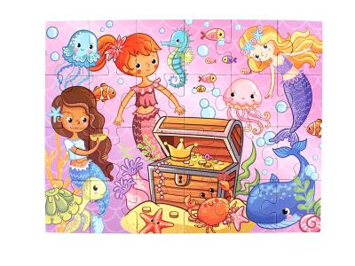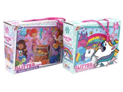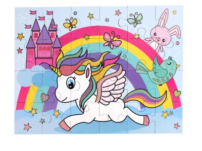 Pussel 24 bitar med motiv av Unicorn och regnbåge eller sjöjungfru och skattkista. Mått: 30x40 cm. Rekommenderas från 3 år. CE-märkt.