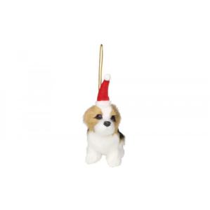 Hängande dekoration i form av en hund med tomteluva.