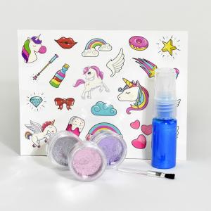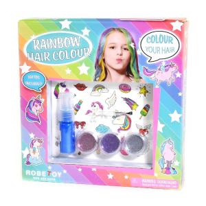 Förtrollande set med hårspray, glitter och tatueringar för barn! Innehåller 3 glitterburkar, hårspray, borste och magiska tatueringar med enhörningar, hjärtan och regnbågar.