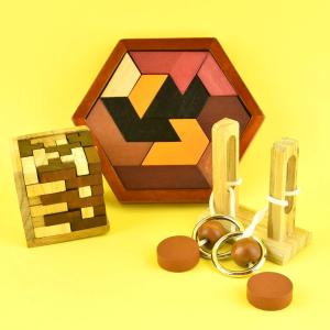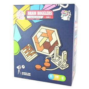 Detta intelligensspel innehåller tre olika träpussel i en och samma förpackning, vilket ger varierad och långvarig hjärngympa. Målet är att plocka isär och sätta ihop pusslen igen – lättare sagt än gjort!