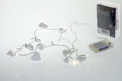 Ljusslinga med 10st varmt vita lysdioder, dekorationer med 15cm:s mellanrum. 50cm ledning till batterifacket. Hjärtana är ca 2x2cm.