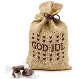 Jutesäck med texten GOD JUL som är fylld med olika julkolor; pepparkakskola, glöggkola och chokladkola.