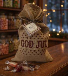 Jutesäck med texten GOD JUL som är fylld med 400g av olika härliga julkolor