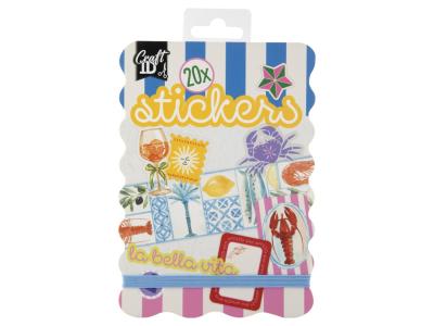Detta set med 20 ark klistermärken innehåller en härlig mix av inspirerade motiv av vattendjur, dekorativa texter, hjärtan samt mat och drycker.
