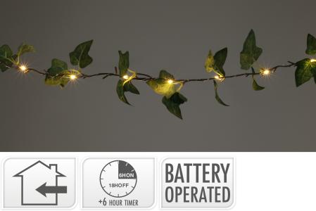 Batteridriven LED-ljusslinga med konstgjorda murgröneblad för inomhusbruk. Flexibel design som passar bokhyllor, väggar och fönster. Timerfunktion (6h på / 18h av).