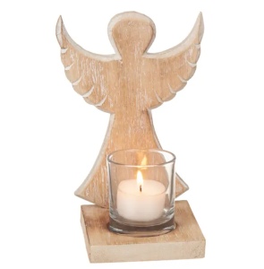 Denna änglaljushållare i trä är mer än bara en ljusstake – den är en symbol för lugn och skönhet, perfekt för att skapa rofyllda stunder i hemmet.