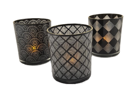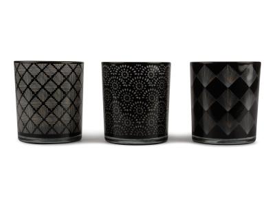Stilfulla svarta ljuslyktor i 3-pack, kommer i set om en av vardera mönster. Materialet: glas Mått: 8,8X 10cm.