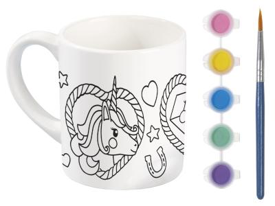 Måla din egen enhörningsmugg i porslin! Setet innehåller 5 färger, 1 pensel och instruktioner på förpackningen.