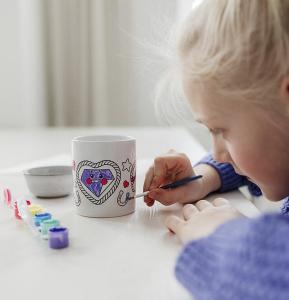 Detta roliga pysselprojekt passar barn från 4 år och uppåt och låter dem utveckla kreativitet, färgkänsla och finmotorik. När muggen är färdigmålad får barnet en unik och personlig mugg som kan användas som dekorativ detalj eller present.