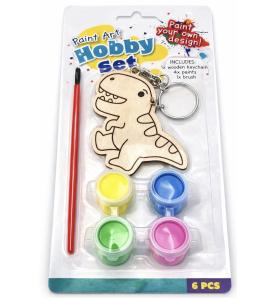 Setet innehåller en dinosaurieformad nyckelring i trä som du själv kan dekorera med de 4 medföljande färgerna. Med hjälp av den inkluderade penseln kan du enkelt måla din dinosaurie i färgglada nyanser och skapa en unik design som ingen annan har.