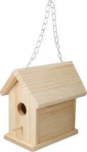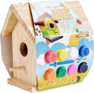 Kreativt måla-ditt-eget-fågelhus-set med träfågelhus, 8 akrylfärger och pensel. Häng upp det med medföljande kedja.