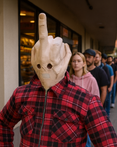 Då är denna latexmask formad som en hand med uppsträckt långfinger något för dig!