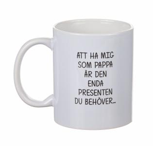 Rolig mugg i porslin med texten "Att ha mig som pappa är den enda presenten du behöver...". En kul och självsäker gåva från pappa – perfekt som julklapp eller födelsedagspresent till barnet!