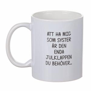 Rolig mugg i porslin med texten "Att ha mig som syster är den enda julklappen du behöver...". Den perfekta julklappen från en självsäker syster till sitt syskon – full av humor och syskonkärlek!