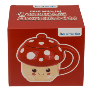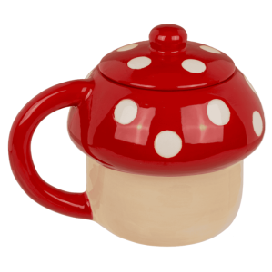 Söt mugg i keramik formad som en svamp med vitt-prickigt rött lock och gulligt ansikte på framsidan. Perfekt för kaffe, te eller varm choklad.