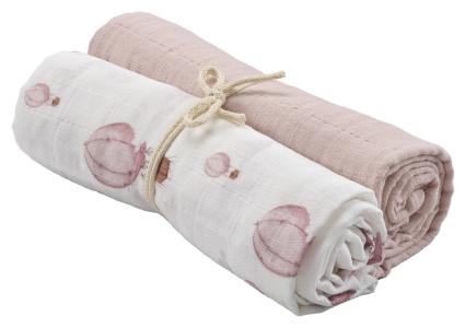 Setet innehåller två filtar i storleken 70x70 cm – en enfärgad och en mönstrad i rosa toner. Den klassiska muslinväven ger god andningsförmåga, vilket gör filtarna perfekta för varma dagar i barnvagnen eller som ett lätt alternativ till täcke.