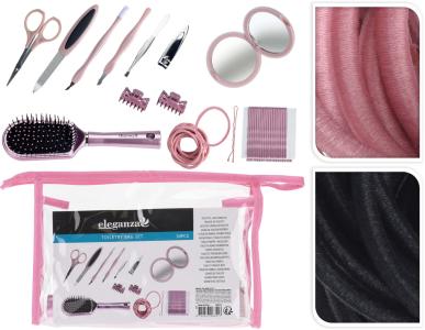 Resenecessär set i 50-delar innehållande bl.a. spegel, nagelfil, nagelsax, nagelklippare, pincett och mycket mer. Necessären är ca 25x16x5cm. Materialen är plast och metall.