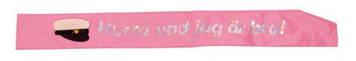 Rosa ordensband att pryda studenten med. Orderbandet har texten: Hurra vad jag är bra.