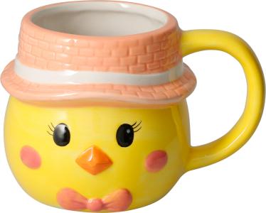 Söt påskmugg i keramik med kycklingmotiv och aprikosfärgad hatt. Perfekt för kaffe, te eller varm choklad till påsken.