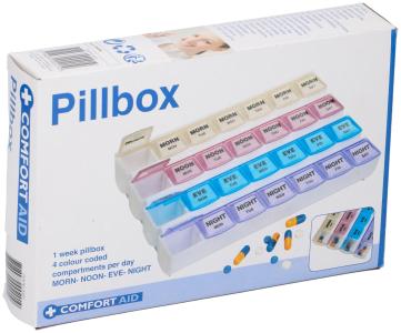 Pillerbox för morgon, förmiddag, eftermiddag och kväll. Boxen är till 7 dagar. Text på locken är på engelska. Färgerna är olika beronde på vilken tid på dygnet tabletter ska tas. Mått:ca 19X13X3cm och varje fack är ca 2,5X2,5X2,5cm. Material:plast.
